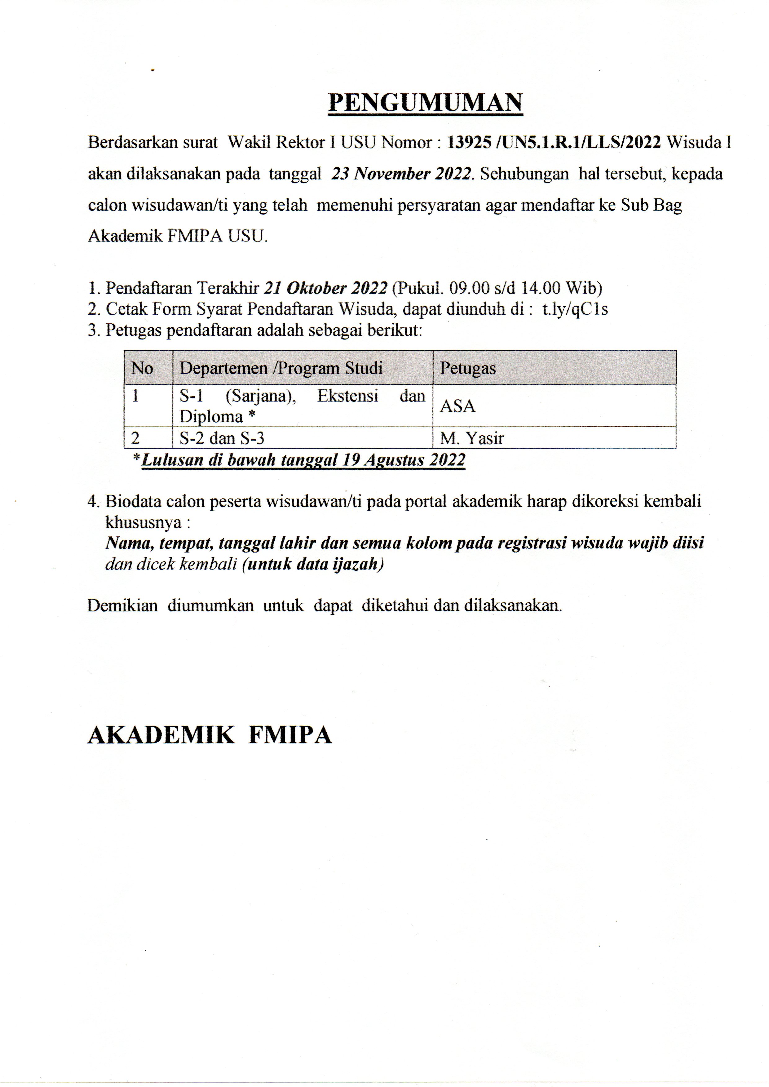 Berdasarkan surat Wakil Rektor I USU Nomor : 13925 /UN5.1.R.1/LLS/2022 Wisuda I akan dilaksanakan pada tanggal 23 November 2022. Sehubungan hal tersebut, kepada calon wisudawan/ti yang telah memenuhi persyaratan agar mendaftar ke Sub Bag Akademik FMIPA USU. Pengumuman ini berlaku untuk lulusan yang telah dinyatakan lulus dibawah tanggal 19 Agustus 2022. Lebih lengkap dapan mengunduh pengumuman berikut.